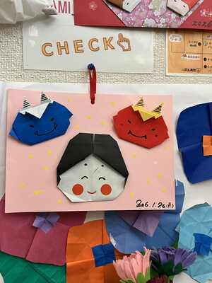 2月3日の節分に向けて、お多福さんと鬼を作りました。