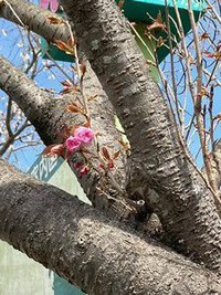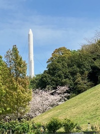 ピンク色の桜の木々が公園の広場を縁取り、散策をする人、一人用のテントで