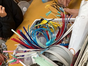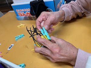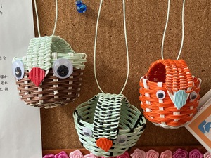 フクロウはクラフトの色を選びバランスを見ながら編み込んでいきます。