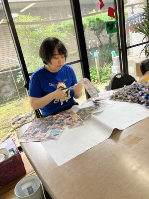 挙手のあったSちゃんが、写真のプリントを丁寧にハサミで切って