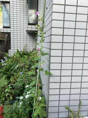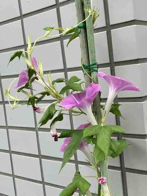 朝顔がぐんぐん伸びて、毎朝可愛らしいピンクの花を見せてくれます。
